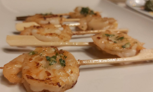 • HUEVOS RELLENOS DE LANGOSTINOS SOBRE CAMA DE GUACAMOLE BAÑADO EN SALSA TARTARA